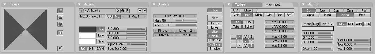 Anime el valor alpha del de las partículas del halo de 1.0 a 0.0 en los primeros 100 frames. Esto hará que sean mapeadas al período de vida de las partículas, como es normal. Dese cuenta de la propiedad Star en el material de las chispas (figure 20-17). Esto modela un poco las chispas. También podríamos haber usado una textura especial para conseguir esto, de todas maneras, en este caso, la manera más fácil es usando la propiedad Star. los sistemas de partículas.