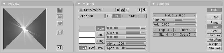 Los botones de material cambian a los botones de halo. Elija line, y ajuste lines: a un valor de su elección (puede ver el efecto directamente en material-preview). Disminuya halosize: a 0.30, y elija un color para el halo y para las líneas (propiedades del halo.). Ahora puede renderizar una imagen con f12, o una animación completa y ver miles de estrellas volando alrededor (estrellas disparándose.).