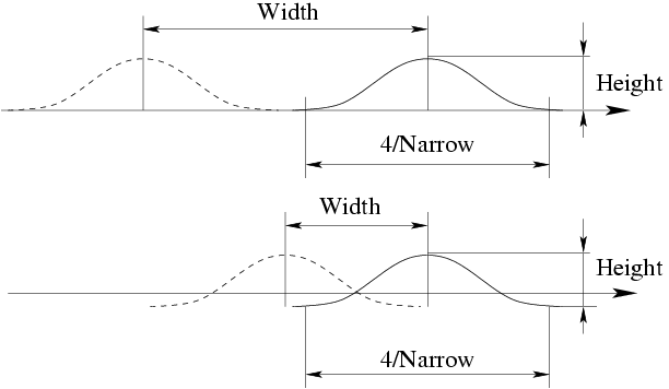 El control numérico speed define la velocidad, en unidades por frame, de la perturbación. El control numérico height define la altura, en unidades de Blender sobre el eje Z, de la perturbación (figure 21-6). Si el botón Cycl esta presionado, el botón numérico width representa la distancia, en unidades de Blender, entre la mayor distancia de dos perturbaciones seguidas, y el efecto total de la onda esta dado por la envoltura de todos los pulsos únicos (figure 21-6). Esto tiene un efecto indirecto en la amplitud de la perturbación. Siendo las perturbaciones de forma Gaussian, si los pulsos están muy cerca unos de otros, la envoltura no podría alcanzar el punto z=0 en ningún momento. Si esto es el caso, Blender en realidad reduce toda la onda de forma que el mínimo sea cero y, consecuentemente, el máximo es menor que el valor de la amplitud esperada, ¿cómo se ve al final de características del frente de onda. Al ancho real de cada pulso de estilo Gaussiano está controlado por el botón numérico narrow, cuanto mayor sea el valor más se estrechará el pulso. El ancho real del área en la que un pulso único sea considerablemente diferente de cero viene dado, en unidades de Blender por 4 dividido entre el valor de narrow. Esto es, si narrow es 1, el pulso tiene 4 unidades de ancho, y si narrow es 4 el pulso tiene 4 unidades de ancho.