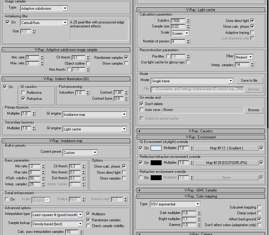 Buenas compañeros. En vista que en la mayoría de trabajos piden Vray, he decidido pasar las escenas que tenían con Mental a Vray. El problema que se me ha planteado son los tiempos, que pensaba que mejorarían, pero ha sido todo lo contrario, han empeorado y bastante. Os adjunto una escena de un mercado que ha una resolución de 1000 por 720 ha tardado más de 9h y 30 minutos en un Quad Core con 4 Gb y XP. Adjunto los parámetros de Vray. La escena contiene 9 luces, 5 Vray Light (con 1000 subdivisiones cada una) y 4 luces fotométricas (2000 subdivisiones cada una). La pregunta es como bajar los tiempos sin que perjudique demasiado en la calidad final del render.