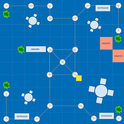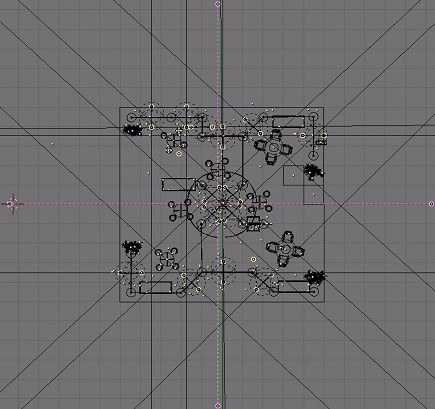 Para extrusionar, hay que estar en modo de puntos. Seleccionamos todo. Letra: a (sirve tanto para seleccionar como para deseleccionar). En el menú Mesh (izquierda) / extrude / ok vemos como podemos crear los puntos y desplazarlos al mismo tiempo. Podemos incluso, inclinar el eje para que no sea perpendicular. Cuando terminamos, los puntos se quedan seleccionados. En cualquier momento, podremos volver a seleccionar el objeto y modificar su forma, simplemente desplazando estos puntos. Por ejemplo, si pulsamos la tecla s (escalar), podremos modificar la anchura de la parte superior de nuestro objeto. Junto a la ventana de edición de puntos-objetos, hay un menú que se utiliza para cambiar entre los 5 modos de visualización posibles: cajas-líneas-sólidos-sombras-texturas. En realidad, viene en inglés: bounding box-wireframe-solid-shaded-textured. La mejor calidad es textured, pero también es la de visualización más lenta. Bounding box se visualiza a la máxima velocidad, pero solo se ven cajas en modo línea. Wireframe permite ver todas las líneas del modelado. En esta actividad, se suele trabajar en este modo. Es el que hemos utilizado hasta ahora. Los otros 3 modos consumen muchos recursos de la máquina, pero pueden ser realmente espectaculares. Con un ordenador moderno, el modo textured o shaded y la facilidad de movimientos de Blender podremos dejar impresionado a un cliente. Realmente, se tiene la sensación de pasear por un espacio. Se nota, que el programa en origen era un engine de videojuegos. La guinda, puede ser utilizar radiosidad. La radiosidad, es un tipo de luz, muy costos a de calcular, que simula los rebotes de la luz entre los objetos. De tal modo que la luz reflejada o emitida por los mismos afecta al conjunto. Ver, ¿cómo se aplica esta técnica en Blender, ocuparía todo el tutorial. Por último, existen dos modos diferentes de visualizar los objetos en función del modo en que se forman sus caras: smot (suave) y solid (duro). Una esfera facetada es una forma dura. Una pelota es una forma suave. Para hacer objetos suaves, diseñamos formas facetadas y las suavizamos. Esta propiedad no es solamente una visualización, sino que es así cómo queda al generar la imagen final. El objeto que acabamos de crear es proporcional, ya que lo hemos calcado con precisión, partiendo de un dibujo que ya lo era. Sin embargo, todavía no está a escala. Para trabajar a escala, se utiliza la rejilla del programa. Esta es una cuadricula dinámica, que proporciona cuadrículas cada vez más finas, a medida que ampliamos la vista. Lo primero que vamos a hacer, es plantear toda la escena. Como sabemos, el estánd es básicamente un cuadrado de 10 por 10 metros. Bien, previamente mi amigo Pedro estrada, ha diseñado el stand. Ha preparado un dibujo en planta sobre una cuadricula de 1m. X 1m. Nosotros, haremos coincidir esta cuadrícula con la de Blender. Entonces, solo tendremos que colocar los objetos 3d, en las mismas posiciones y a la misma escala en la que se encuentren en el dibujo. Este es el dibujo de la planta: