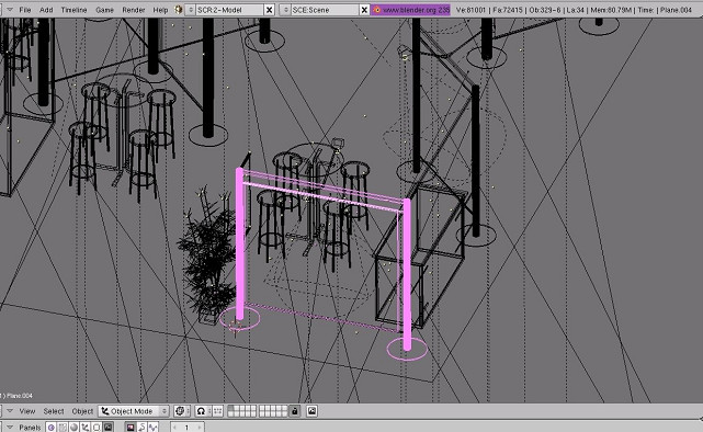 A la derecha, en cualquier ventana, hay unos pequeños cuadrados (20, en total). Cada uno representa una capa. Las capas, sirven para guardar objetos de una manera ordenada. La tecla m, hace aparecer una ventana con las veinte capas. Escogemos la capa a la cual queremos enviar los objetos seleccionados, y desaparecen de la capa actual para ir a parar a la que hayamos seleccionado. El menú de capas de la ventana, sirve para escoger la capa en la que queramos trabajar. Las capas son muy útiles. No necesitamos modelar un objeto más que una vez. Los guardamos en capas diferentes y los vamos copiando en al capa de la escena activa, según los necesitemos a medida que progresamos en el diseño. Puede ser un buen momento para pararse y pensar. ¿Cuál podría ser el método de modelado más rápido? Como siempre, componer con varios objetos unidades mayores que se puedan repetir, es decir módulos. Veamos, en este caso cada lona viene a formar una especie de grupo con los dos perfiles que la sostienen, las lámparas y las bases circulares. Podríamos hacer un solo modulo de estas unidades, y luego repetirlos y adaptarlos.