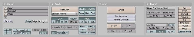 A parte de elegir el número y posición de los focos, podemos realizar otras modificaciones en los mismos. La potencia y la composición de color de la fuente son parámetros esenciales. Con frecuencia, se utilizan focos de colores. La luz violacea da profundidad. La luz roja o amarilla trae los objetos al primer plano. Iluminar un stand, es un caso bastante particular. Un caso general, podría ser un solo objeto, como una botella, un jarrón o un libro. La iluminación en un estudio fotográfico consistiría, en una luz de flash lateral. Es decir, una fuente de luz blanca, que simule el sol. Se coloca un difusor delante de la fuente, para suavizar y difundir mejor la luz. El resultado es bastante similar a un día nublado. Esto, ilumina correctamente los planos medios y un lado del objeto, pero deja envuelto en las sombras el lado opuesto. Aunque no sé pretende aclarar completamente (se perdería volumen), si habría que utilizar una iluminación de relleno para estas zonas. La práctica habitual, consiste en colocar un rectángulo de poliespan, en ángulo, de tal manera que recoga luz de la fuente primaria y la refleje sobre las áreas opuestas de nuestro objeto. Esta práctica real, como otras muchas, no se puede llevar a cabo digitalmente de una forma literal. Como foco primario, se suele utilizar luz blanca de tipo spot (es el único tipo que proyecta sombras), ajustando el tamaño del cono, para que cubra ampliamente el objeto. Se coloca de lado bastante alta. Otros tipos de focos, como Sun también son apropiados, pero no proyectaran sombras del objeto, sobre el suelo. Estas sombras, son esenciales para que el objeto se sostenga bien y destaque. Como luz de relleno, habrá que duplicar el foco principal, moverlo al otro lado y atenuar su intensidad hasta que se vea un poco el objeto por ese lado, sin llegar a dañar el modelado del mismo. Si pulsamos la tecla f10, veremos los paneles con todas las funciones necesarias para obtener imágenes o animaciones. En nuestro caso, lo que necesitamos son imágenes. Escogemos formato y resolución, en el panel de la derecha. El formato Targa, (*.tga), es el estándar de la industria 3d. Las resoluciones altas, son muy recomendables. 1300 píxeles de ancho o similar. En el segundo panel, por la izquierda tenemos el botón render. Veamos lo que pasa. Parece que genera una imagen en una ventana. Sin embargo, la imagen no tiene mucha calidad. Los bordes están pixelizados. Debemos activar el botón blur. Esto forzara al motor de render, a realizar antialiasing, es decir a difuminar los bordes de los objetos. El proceso se llevara a cabo en varias pasadas. Cuando termina, dispondremos de una imagen perfecta. En el panel de la izquierda del todo, abajo hay dos botones. Sirven para que las imágenes se rendericen en una ventana independiente o en la vista 3d. Si queremos renderizar desde cualquier parte del programa utilizamos la tecla f12. La tecla f11, pulsada dos veces muestra la última imagen renderizada. Para guardar las imágenes utilizamos el menú: file / save image.