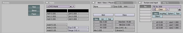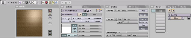 Ahora hay que ajustarla al objeto. En el panel image, existen un buen número de botones para este fín. Calalpha aplica transparencia a la textura, es decir la mezcla al 50 por ciento con el material que tuviese previamente. El botón rot90, permite rotar la textura de 90 en 90 grados, en la cara en la que este aplicada. La barra deslizante filter se refiere, al grado de nitidez de la textura. 0.10 es nitidez máxima, 25.00 es suavidad máxima. En condiciones normales, se pone 0.10. Pero si alguna textura destaca demasiado, puede ser un buen método para disimularla. Continuemos. El botón extend, clona automáticamente el último píxel del borde de la textura, y lo repite en el resto de caras del objeto. Más abajo, tenemos dos barras deslizantes muy importantes. Xrepeat e yrepeat. Si el valor es la unidad, la textura se acopla a la cara del objeto repitiéndose una sola vez. Vamos, que se adapta a su forma. Si la cara y la textura no tienen tamaños proporcionales la textura se deforma. Normalmente, esto no es interesante, aunque a veces puede servir para aprovechar una textura inapropiada. Por ejemplo, podemos hacer la tarima de madera del suelo partiendo de una textura cuadrada o a la inversa. Por último, abajo tenemos 4 botones que, sirven para panelar la imagen, es decir para que se vea el fragmento de textura que queramos. La ventana de preview nos muestra el resultado. Mediante f12 renderizamos para ver el resultado. Podemos desplazar la imagen en cualquiera de los dos ejes. Bueno, la combinación de todas estas herramientas, hace posible, aplicar una textura en una cara de un objeto, con total precisión. El panel de la derecha, Anim and movie, es para utilizar texturas animadas. Pulsamos f5. De nuevo, nos encontramos en los paneles de materiales. En la ventana de preview, aparece nuestra imagen. Es importante observar, que pueden apreciarse en la misma, los efectos de iluminación. El panel de la derecha, está compuesto por 3 pestañas: texture, Map Imput y map todo. La pestaña Map Imput, es muy interesante. Tiene númerosas opciones para modificar el mapeado de las superficies. Para obtener buenos resultados, es preciso emplear un método de mapeado adecuando a la forma general de los objetos. Los objetos cúbicos, se mapean con el método Cube. Los objetos de forma esférica o cilíndrica precisan sus propios métodos. En nuestro caso, activamos el botón orco.
