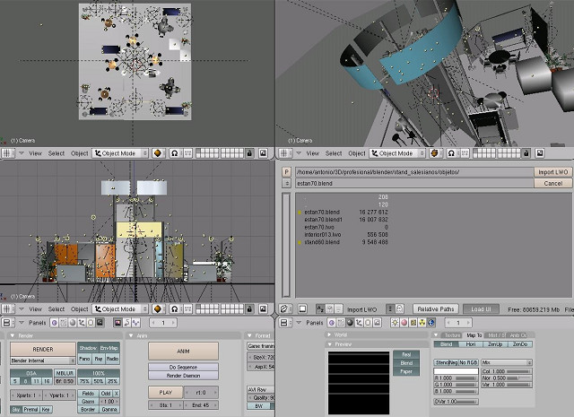 programa libre que cuenta con un desarrollo vertiginoso. Sale una versión nueva o una actualización, aproximadamente cada dos meses. Blender, ha sido definido por sus creadores, como una aplicación de campo, es decir una herramienta de uso inmediato. Si bien, sus renders no pueden competir en calidad con los de los tres o cuatro programas de primera línea, se trabaja más rápidamente que en cualquiera de ellos. He utilizado Blender para diseñar stands, expositores etc, en tiempo récord, con resultados aceptables. Como practica, realizaremos un stand sencillo en el tutorial. Esto nos permitirá comprobar la potencia y versatilidad de Blender. Al mismo tiempo, veremos cómo se modela y textura un objeto, la iluminación de los escenarios, la utilización de cámaras, la obtención de las imágenes, etc.
