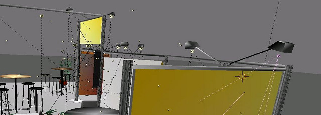 Bien, ahora estamos realmente preparados para duplicar los módulos del stand, ajustándolos al diseño. Para ello, agrupamos elementos y los copiamos y modificanos juntos. Parece mucho trabajo. Sin embargo, al disponer de módulos terminados se avanza muy deprisa. Vamos cambiando de vista para ajustar correctamente las alturas. Nos movemos para comprobar los resultados y ampliamos la vista lo que sea necesario para ajustar unos objetos a otros de forma correcta. Podría pensarse, que los focos que tenemos en la escena, son suficientes para garantizar una buena iluminación. No es así. La luz en los programas de 3d tiene limitaciones. La difusión, no es tan rica como en la realidad. Por eso, es necesario, establecer una iluminación general, para todo el espacio. No es nada fácil en nuestro caso, ya que debemos asegurarnos de que sea posible obtener imágenes correctamente iluminadas desde cualquier punto de vista. Un solo foco, a gran altura, cenitalmente ilumina tan solo, las caras superiores de los objetos, o sea apenas nada en el estánd. Una luz lateral queda mejor. Sin embargo, solo afecta a un lado. Si los focos están situados demasiado bajos, los objetos proyectan largas sombras. Y esto no queda nada bien. Como se ve, la luz plantea verdaderos problemas. Que es necesario solucionar, en cada situación de una manera distinta. En este caso, la mejor solución fue crear cuatro focos situados frente a cada cara del cuadrado que conforma la planta del stand (figura 7). La iluminación de todo el stand queda de este modo garantizada.