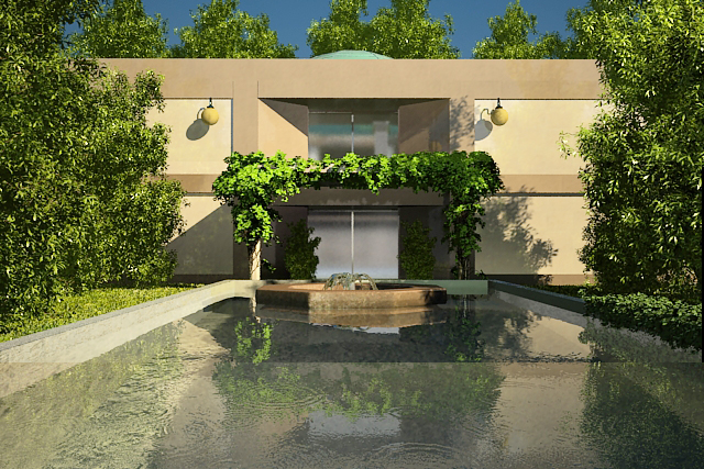 Bueno, yo te recomerndaria al césped utilizar un Vray diplacement, otra cosa que veo es que las columnas no se ven iguales, es decir parecen materiales diferentes o es así tu diseño? La pared amarilla, del centro se ve muy pronuncioado el Bump, muy rugosa, para la distancia desde dónde estas, el agua me gusta mucho, pero el piso que bordea la fuente de agua o piscina, está muy repetitivo, prueba con algo más fresco o de un color menos frío, u otra textura donde no se note lo repetio, y buena suerta vas bien, adelante.