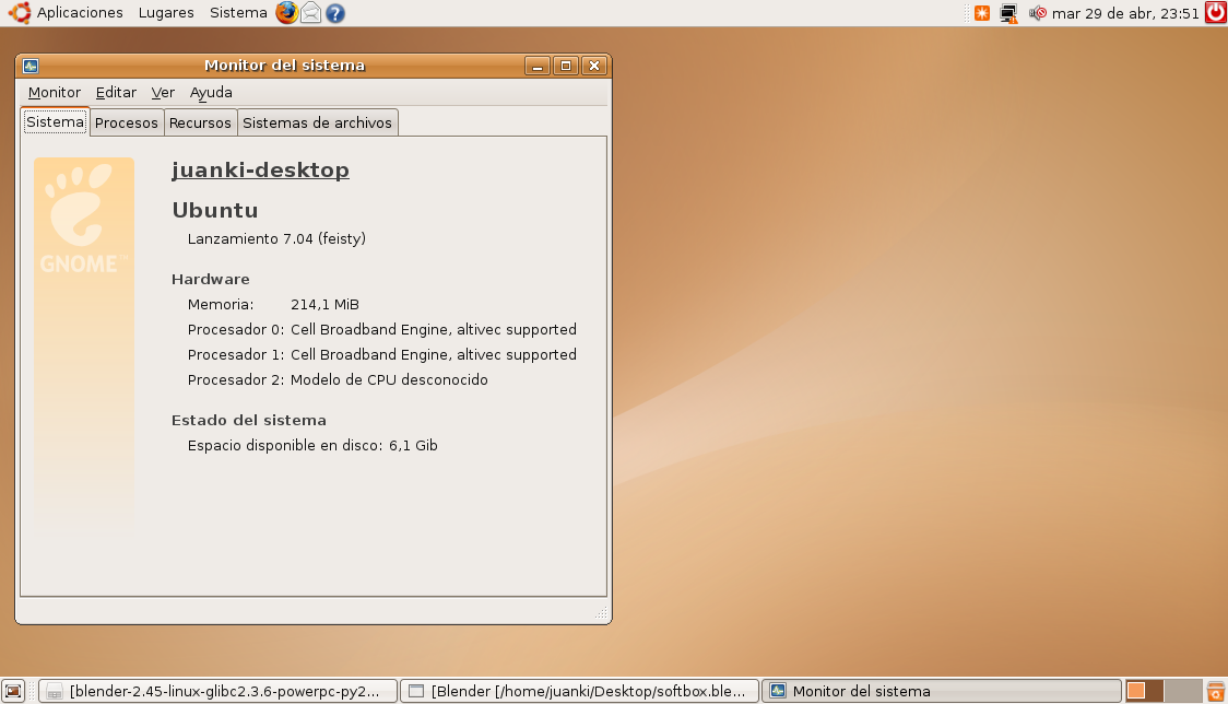 Posdata: El render con Yafray va regular. Ubuntu me detecta solo tres procesadores y uno de ellos desconocido. Al final creo que solo lanza 2 hilos de ejecución y no va demasiado rápido, pero aún tengo que investigas un poco.