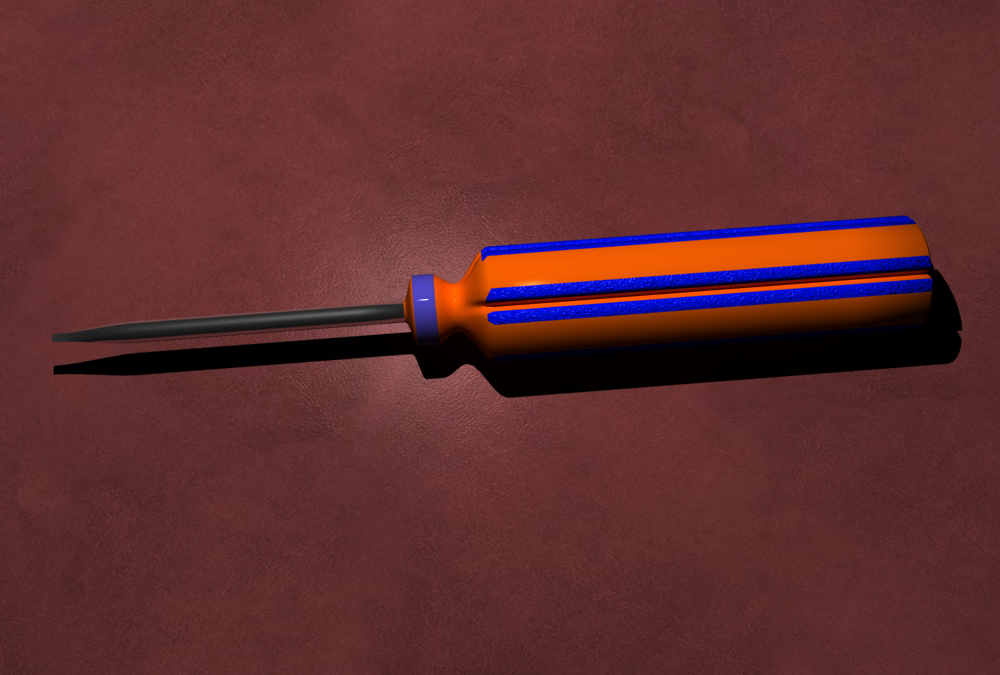 Veo la parte metálica (lo que no es el mango) demasiado corto, así como demasiado uniforme y perfecto. Parece que sea un espejo, fíjate que un destornillador (como casi cualquier objeto de la realidad) tiene imperfecciones. Con el mango pasa lo mismo, demasiado limpio, le quita realismo.