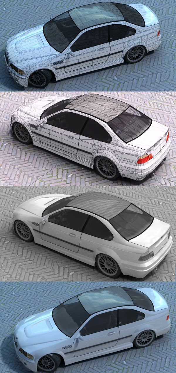 Estoy loco por ese auto. Realmente me fascina el modelo y los BMW. Tiene más que buena pinta para los limitados polígonos. Hay un detalle que salto a mi vista, y es la óptica trasera, parece ser pura textura y se nota mucho, sé que estás limitado en polígonos, pero si te sobran algunos fíjate si puedes hacerle algo, o mejorar la textura. En cuanto al resto no veo nada acotable. Pedido. ¿harías una toma bien pistera de ese auto en 1280, la firmarías y la mandarías para fondo de pantalla? Un saludo. Santiago.