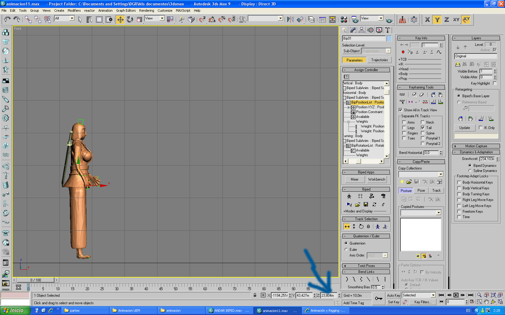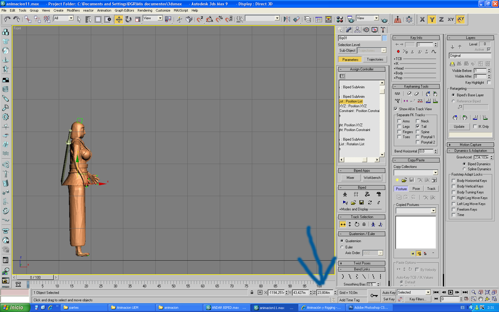 Hola, ¿Qué tal? Tengo un problema con el bípedo, después de colocarle la malla y congelarla con freeze ajusto los envelope y todo bien, hasta que empiezo a animar y tengo restringido el eje Z (según el tipo de coordenadas world) por lo que no puedo mover el Biped hacia arriba o hacia abajo, he probado axis constraint las coordenadas Word local view y nada, no doy con la solución para moverlo en z, he podido observar que se mueve perfectamente por los tres ejes un bípedo nuevo hasta que utilizo freeze para congelarlo, si tuvierais alguna idea de que le pasa y darme una solución sería genial, ya no sé qué hacer, ni que probar, uso 3d Studio Max 9 con Windows XP, dejo unas fotografías adjuntas por si alguien ve algo, dibuje una flecha que señala el único sitio donde puedo mover al bípedo en el eje Z pero claro. Muchas gracias.