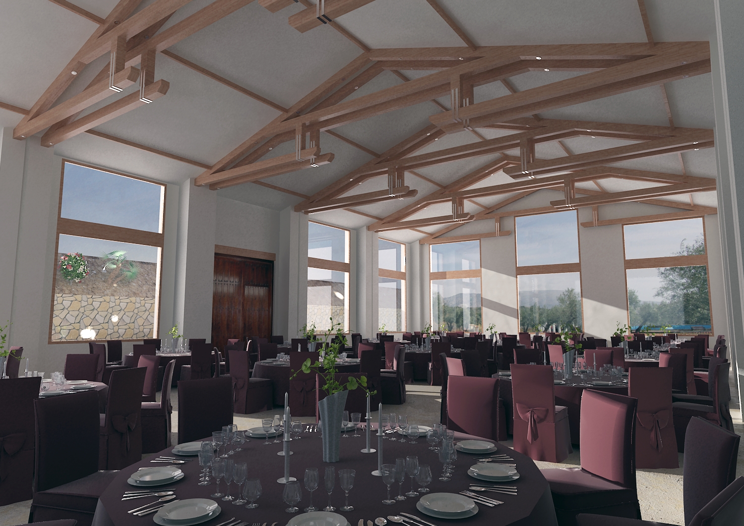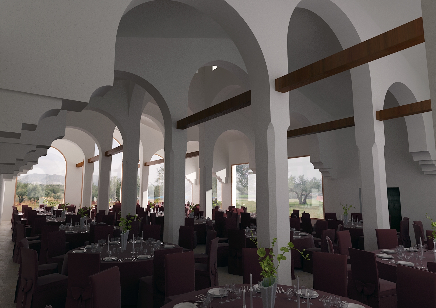 También veo que para un espacio tan abierto, con tanta cristaleta y luz directa, la imagen esta oscura, creo que te faltan rebotes de indirectas, y lo que has puesto en los jarrones de centro de mesa creo que no debería ser completamente verde, las flores quizá quedarían mejor en blanco.
