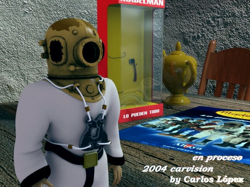 La caja del Madelman se abre por arriba, se saca al tío y luego se cierra, el trabajo que he realizado es el modelado del muñeco y de la caja, el resto es un fondo de planos con fotografía para que no esté desnuda la escena. Pienso hacer un entorno currado, pero aún no sé cuál. Cuando tenga terminado el batiscafo veremos. Gracias por tus críticas.
