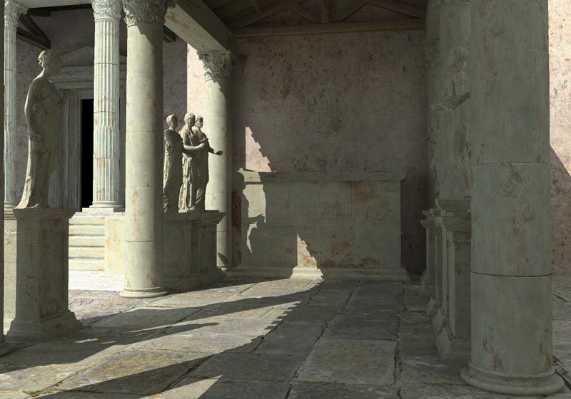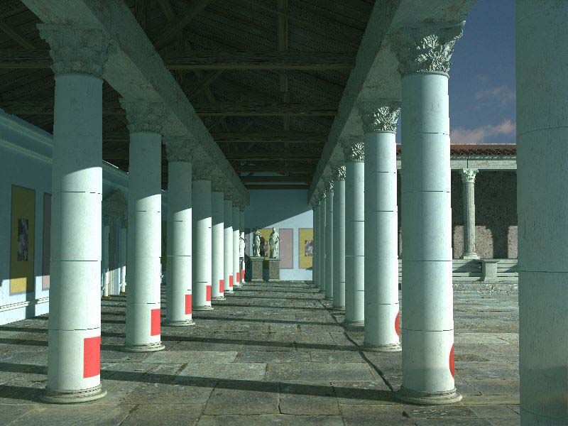 Lo que veis, son imágenes del pórtico sur (casi fielmente lo que era hace más de 2.000 años), pero en el pórtico norte, se han encontrado restos de pintura en los tambores de los fustes, cuando termine con ese pórtico, os enseñaré alguna imagen para que veáis el contraste. Esto es un boceto sin luz ni composición, ya os enseñaré alguna elaboración.