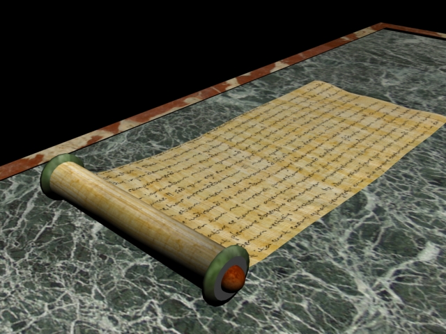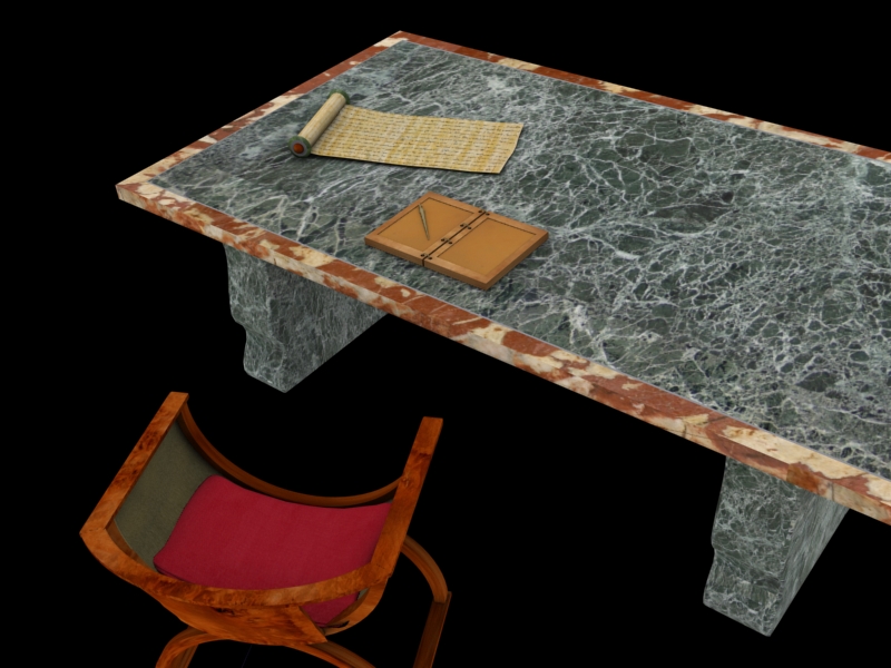 Añado una nueva imagen del escritorio con el pergamino y una tablilla de cera y con la silla. Siguiendo los consejos recibidos en el foro he añadido sombras. Sé que falta el suelo y impide ver bien la imagen, pero no me ha dado tiempo a hacerle un suelo.