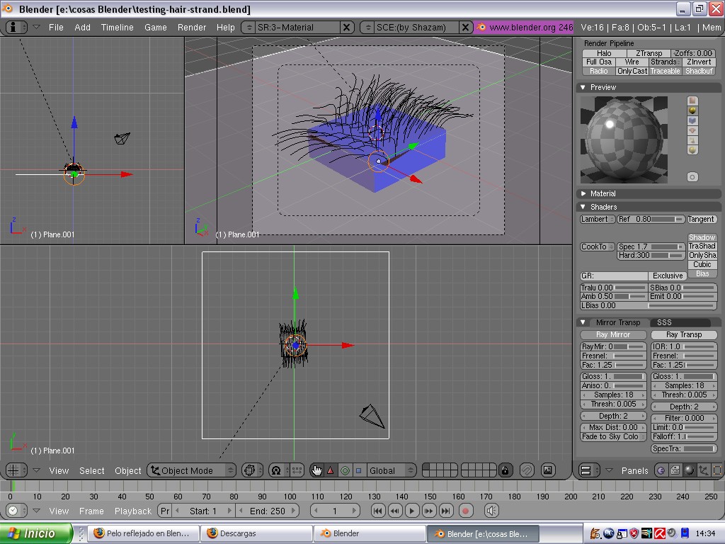 Hola, estoy haciendo algunas pruebas con las partículas de Blender, concretamente con el pelo, y ya he conseguido hacer que este proyecte sombra mediante shadow buffer, pero lo que no logro es que cuando hay una superficie reflectante, esta refleja las partículas, en este caso el pelo. ¿cómo podría lograrlo?