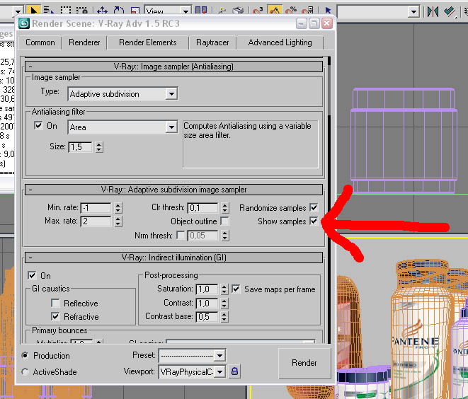 La configuración del Vray es Color Mapping linear multiply, GI:primary Irradiance Map y secondary Light Cache, hay un Vray Sun y materiales Vray.