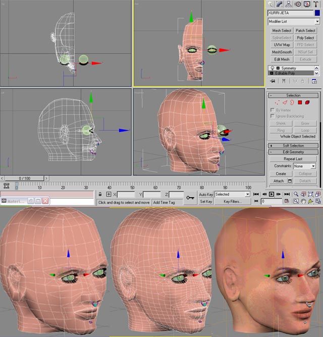 Hola y saludos gente del foro. He modelado una cabeza de una mujer con el 3dsMax 5. Está hecha a partir de la clonación de aristas y procurando no pasarme con los polígonos para que no pese mucho, con la oreja lo he pasado mal y esta podría estar mejor, pero por el resto creo que no está mal y de momento contento estoy. Para las pestañas he realizado un tutorial que está en esta web: http://www.juansiquier.com. Para hacerlas con Splines ya que, el Shag Fur no lo domino mucho y me hace cosas curiosas, pero no serias. ¿hay alguna manera para que el interior de la nariz no se vea iluminada? Parece que tenga una bombilla en la tocha. Espero que os guste y si podéis aconsejar mejor que mejor. Lochapowa gracias por el enlace.
