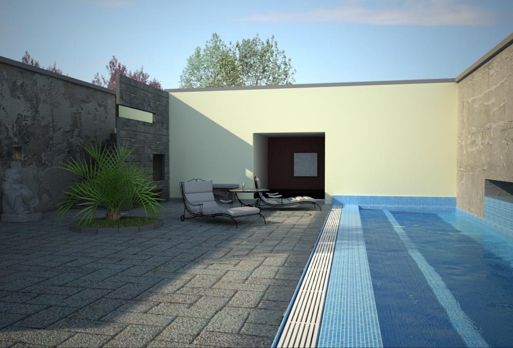 Hola. Me agrada tu escena, se ve muy bien y más con tu textura deteriorada en los muros, le da más naturalidad a tu imagen, aunque coincido con Jovel esa agua de la piscina no me convence, creo que si le das movimiento se vería mejor ya que no distingo donde termina el agua en la piscina y eso le resta realismo, aunque tienes razón que el agua en las piscinas suele ser muy lisa, pero en tu escena no te ayuda. Saludos.