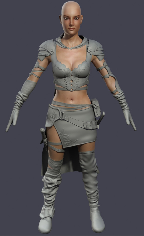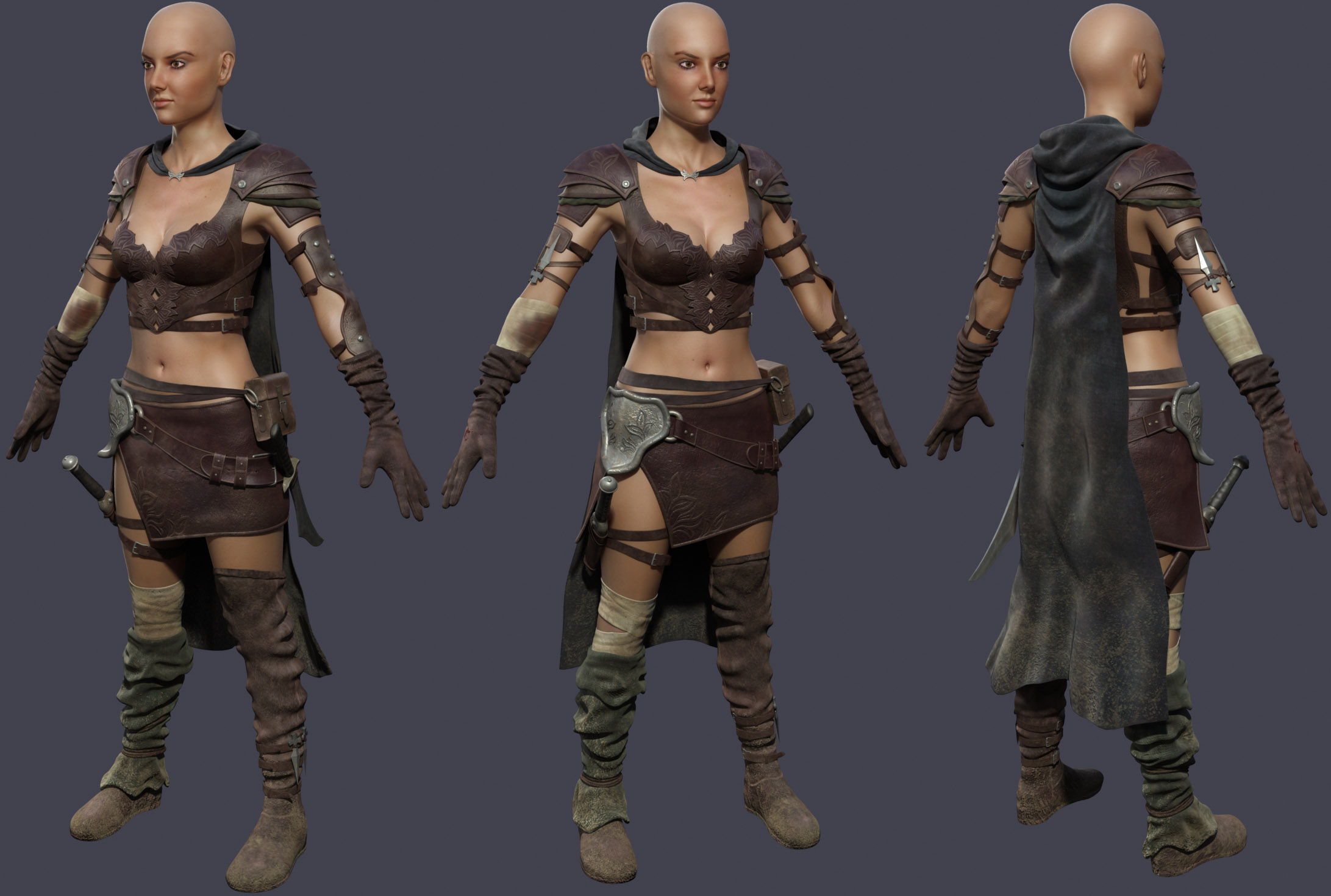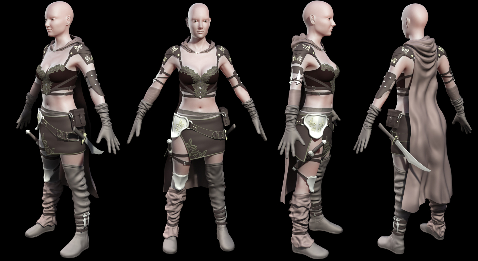 He estado trabajando en un nuevo modelo, una rogue/picara. Lo que veis es solo modelado, nada tiene texturas, solo colores para diferenciar un poco las piezas.