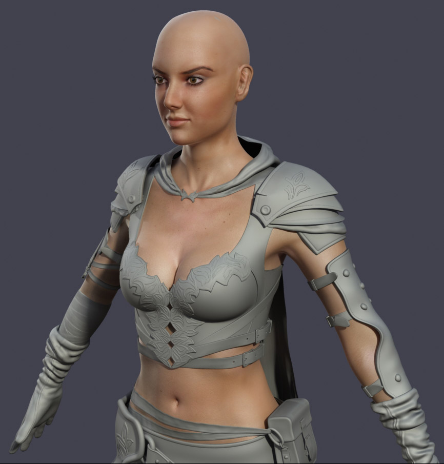 Ahí va un update con las texturas. Infograph3d -> un poco de todo, normalmente tengo una imagen en mí cabeza de lo que quiero hacer, y busco referencias para los detalles, como la ropa y armadura en este caso. Por ejemplo, la parte superior de la armadura lo he sacado de un corse de una modelo de ropa interior, y a partir de ahí lo fui modificando para que parezca una armadura.