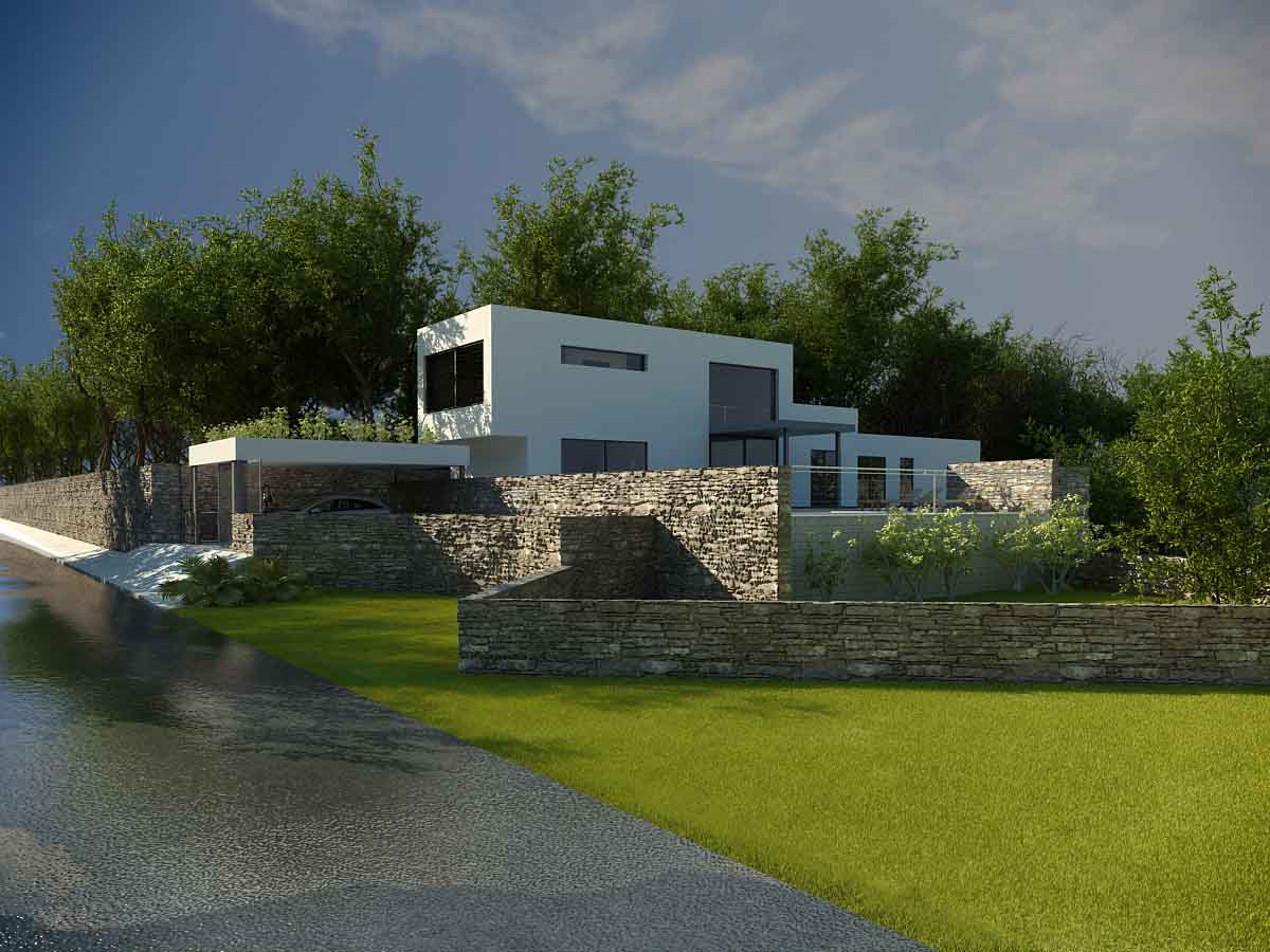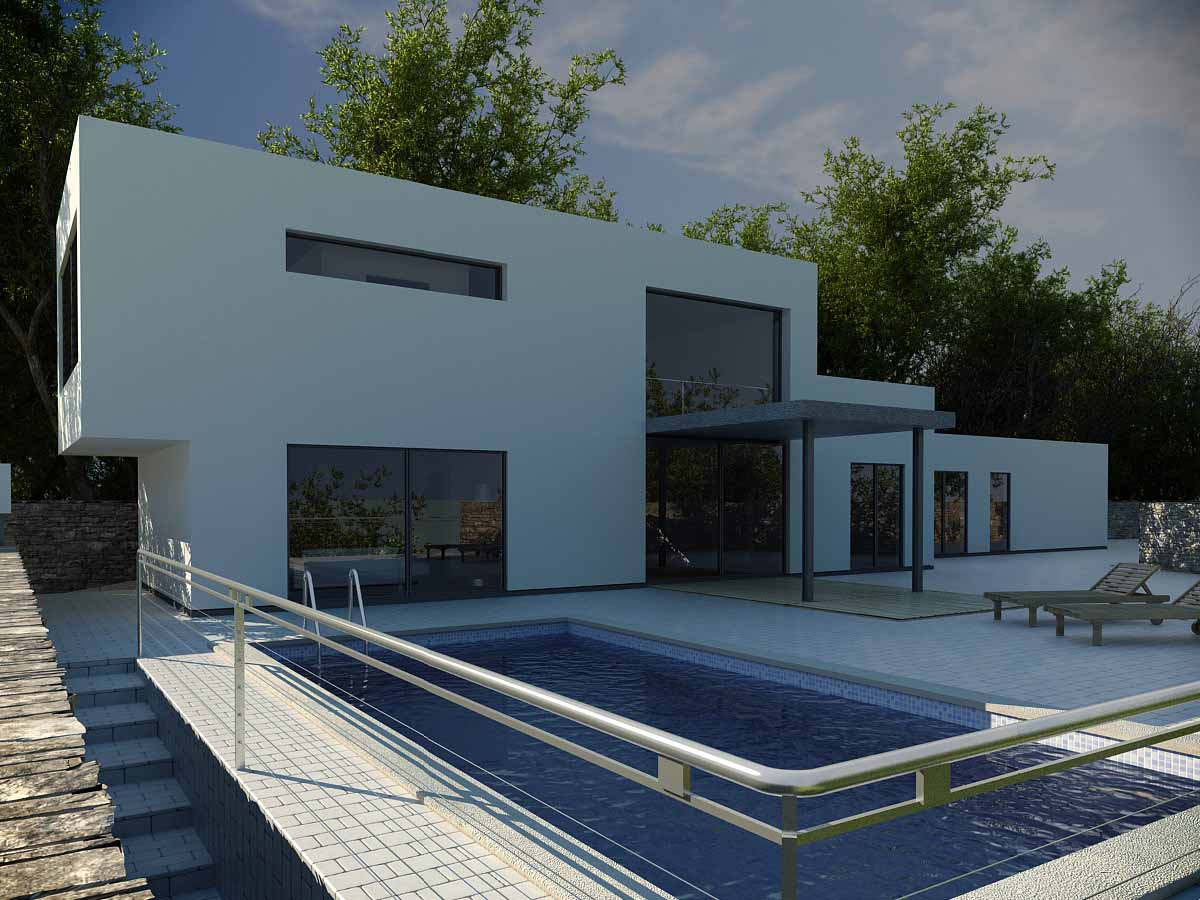 Lo que sí me gustaría señalar es la fantástica luz que has conseguido. Me gusta mucho. Lo mismo para la vegetación: buen acabado. Si me apuras un poco monótona. Lo que me preocupa es que la imagen se queda parca. La casa al ser tan blanquita y cuadrada, y el fondo al ser tan verde se queda un poco en eso. Blanco y verde.