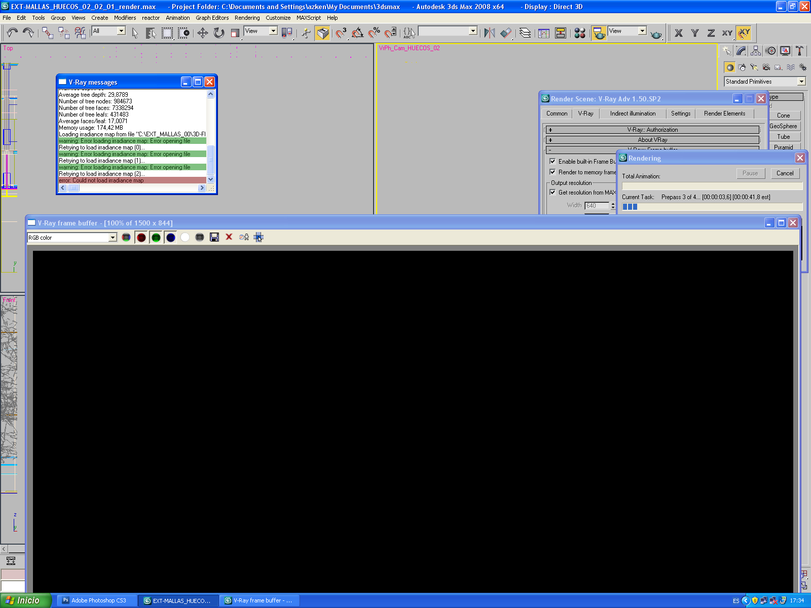 Hago un boceto con Vray irradiance very Low. Es la imagen 01. Cuando voy a lanzar la buena en calidad high me da el primer mensaje de error y no hay forma (error_01.jpg) abro otro archivo de los que he trabajado hoy y me da que no puede cargar el mapa de irradiancia (error_02.jpg) es max 2008 Vray 1.5 service pack 2 ambos legales con licencia (dongle) voy a mandar un mail a support pero planteo la duda por si a alguien le ha ocurrido esto.