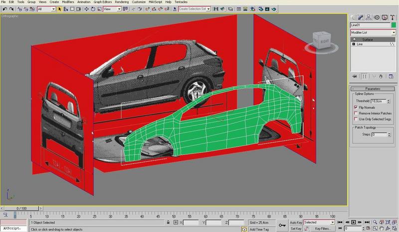 Bueno, al fin comenze a modelar mi primer coche (Peugeot 206). Fui haciendlos Splines desde el view right, y cuando lo termine, le di al modificador surface, y aquí les dejo 1 fotografía de cómo quedo.