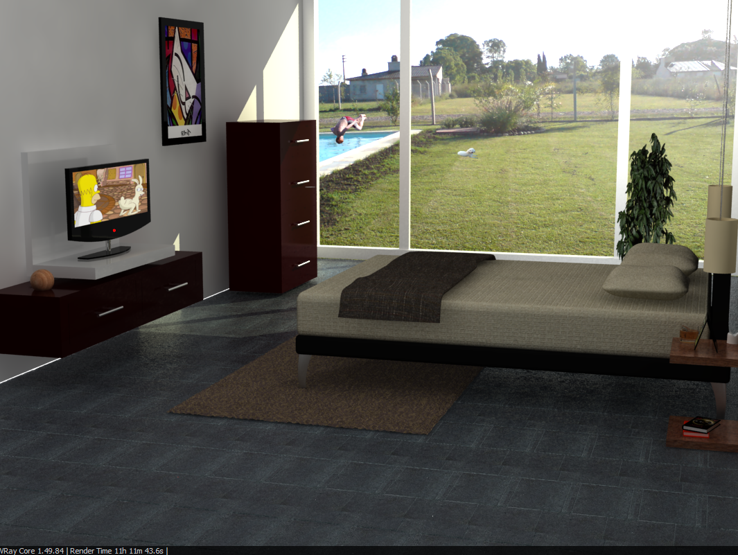 Bueno también veo un poco raros los cojines, la iluminación de ellos, parece que estén superpuestos, quizás sea porque no tienen el mismo texturizado que la cama, prueba a poner igual la cama a los cojines, porque parece raro. Un saludo, esta wai en general e.