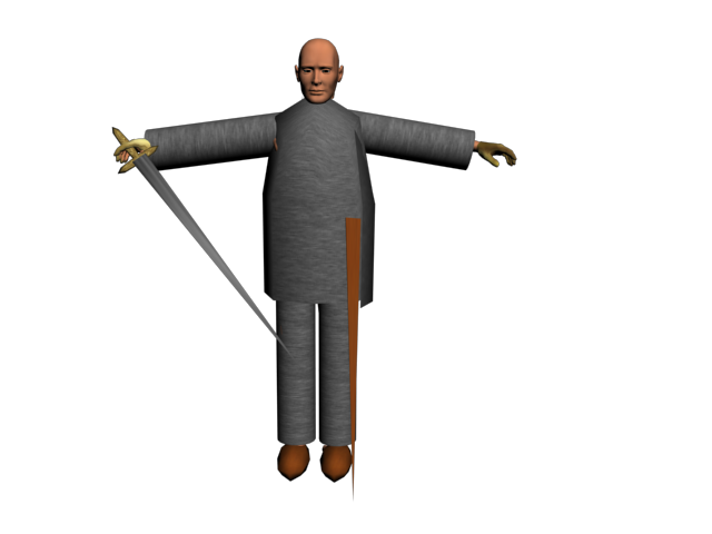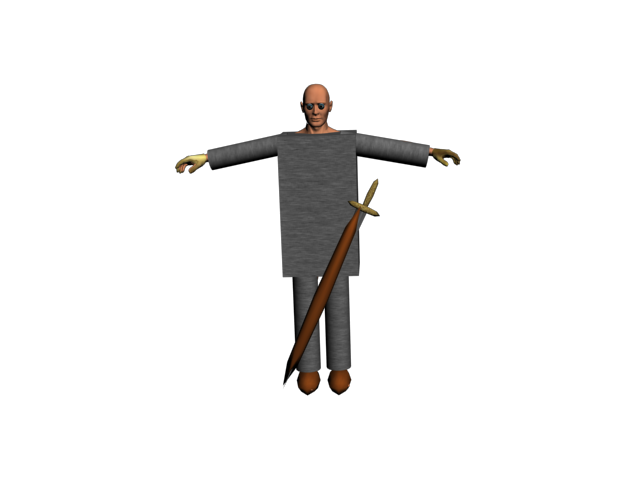 Bien, aquí llega mi primer trabajo de modelado. He modelado un humano y le he puesto una armadura. Mi opinión sincera, es que lo único realista son los guantes y la funda de la espada rota. ¿Qué podría hacer para mejorar la armadura? La hice con una caja y 4 cilindros, pero aún probando distintos modificadores, no conseguí nada.