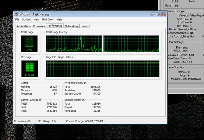 Hola, mi máquina se pone muy lenta cada que renderizo, tiene 3.5 g en Ram, bueno eso es lo que detecta, y un procesador a 2.80gh, 3dsmax 9, service pack 2, Vray 1.5, XP service pack 2, noté que la memoria física casi no la ocupa y la memoria virtual se va al tope adjunto imagen para ilustrarlo, quisiera saber si esto es normal, y si esto podría estar provocando que se colapse el max al renderizar. Saludos y gracias.