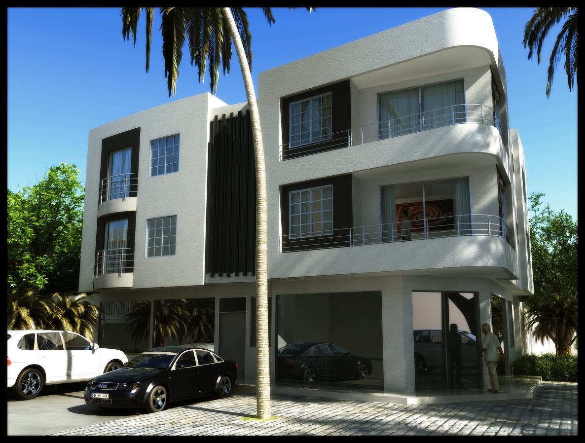 Este es mi último diseño y rendering. Es un edificio de apartamento con locales comerciales en el primer piso, es un concepto minimalista.