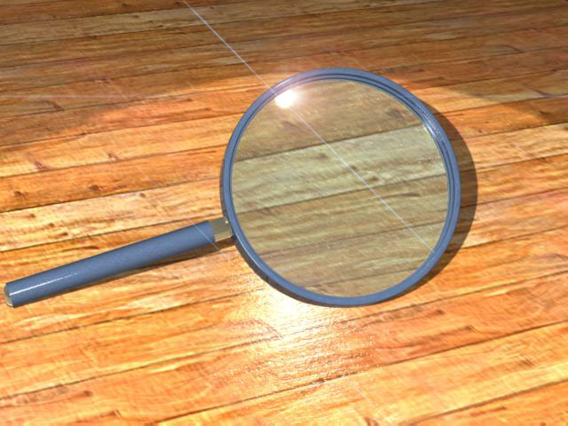 Teniendo en cuenta las recomendaciones de Rappaniu modifiqué los valores del IOR de los materiales y creo que mejoró, la retoqué un poco en Adobe Photoshop, (rayo de luz) ¿ahora sí parece una lupa?