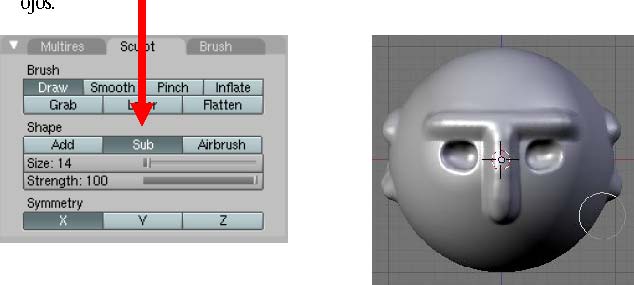 Ahora presionamos en el panel de Sculpt y con la opción Draw, el botón de sub, y haremos los hundimientos de los ojos.