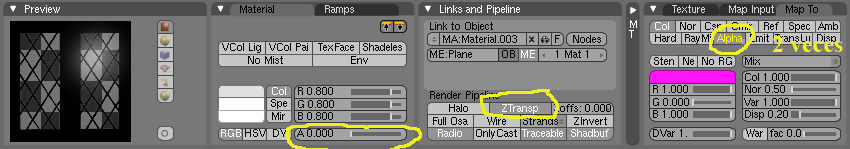 presionando el botón rojo (materials buttons) y en la ventana material, bajamos el alpha a =.000, en la ventana links and pipeline presionamos ztransp, en la ventana map to presionamos el botón alpha.