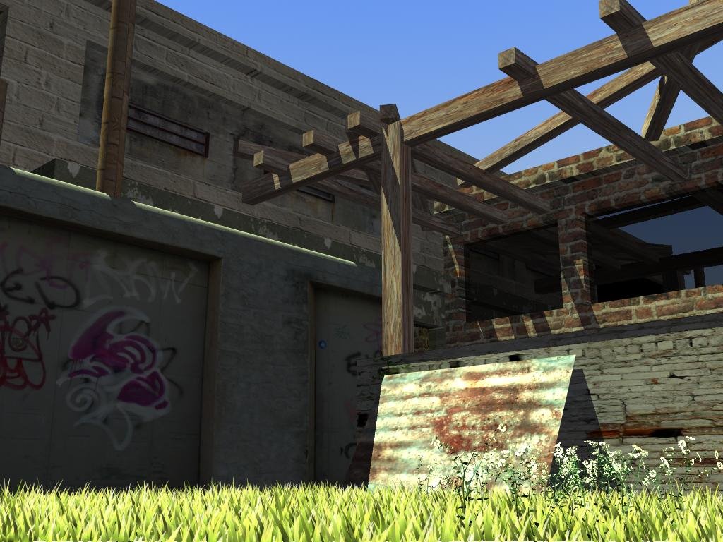 A toda la escena le agregaría más suciedad, un poco de Bump o desplazamiento y el césped más ralo, pero está bien la imagen, sigue con eso.