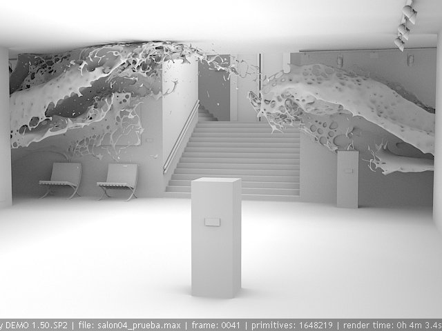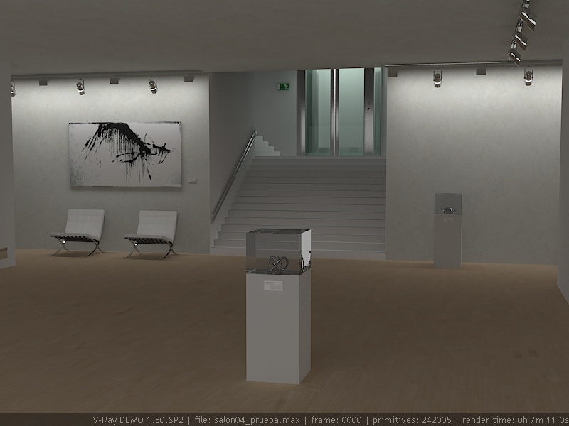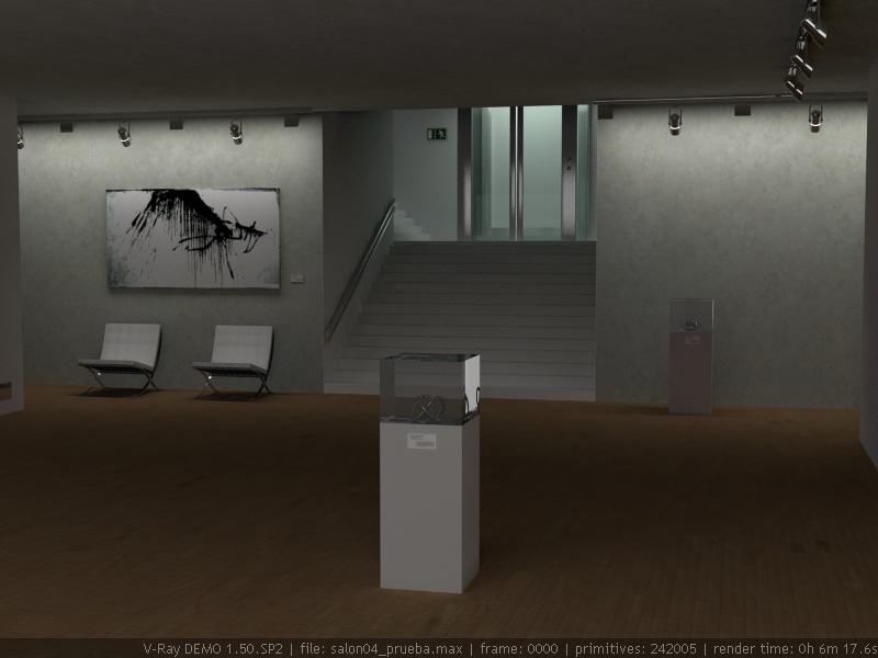 Hola. Me parece que no había publicado nada en el foro de lo poco que he hecho hasta ahora, salvo un mensaje con dudas sobre una tetera voladora el caso es que redescubrí el 3d hace pocos meses y estoy empezando a aprender por mi cuenta. Para mí primera escena medianamente currada me gustaría construir una desconcertante sala de exposiciones. Como no sé modelar, me he bajado una silla Barcelona de una página, de modelos gratuitos, el resto son todo primitivas (con algún mod, para los focos, etc).