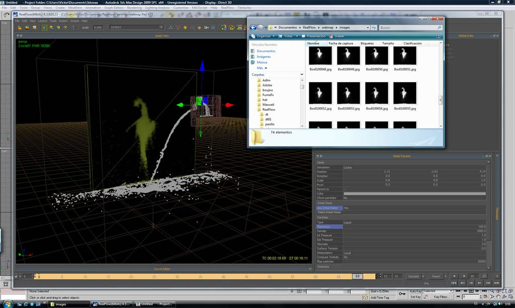 Sobre los wetmaps, sí: en los tutoriales de Real Flow recuerdo un geiser que lo explicaba. (hice todo menos los wetmaps, así que, ahora me pondré a revisarlo). He visto por encima cómo se hacen (activando algunos parámetros); me preocupa más tener la colección de png ya finalizada y luego incorporarla al material en 3dsmax, de lo que ahora mismo no tengo ni idea. (supongo que, será animando el material), ya os contaré cuando llegue ahí. Dejo una nueva fotografía (lástima de Motion Blur).