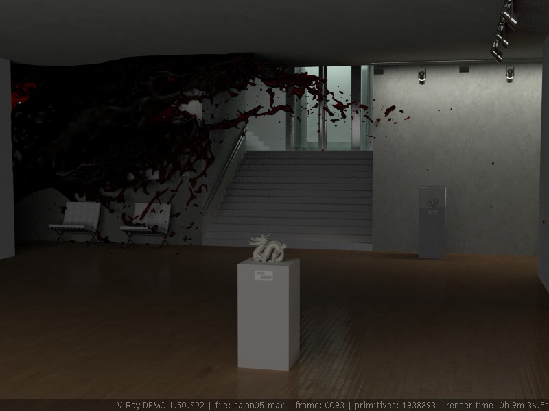 Antes de hacer la secuencia definitiva tendré que simular los fluidos de nuevo con solo 2 emisores, hacer algún que otro ajuste y ver si es complicado manchar las paredes (no me he puesto con eso todavía). Os adjunto alguna propuesta para la animación final. (importando el dragón Stanford), pero lo dicho, de nuevo gracias por cualquier cosa que se os ocurra.