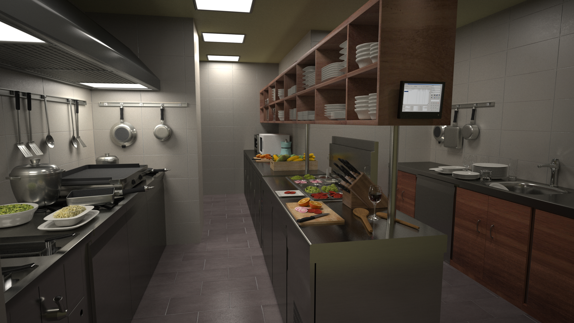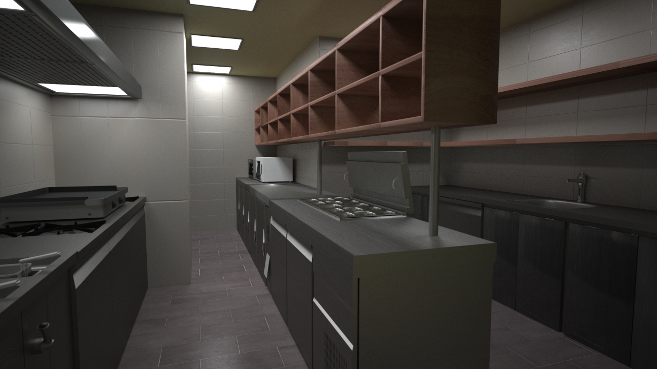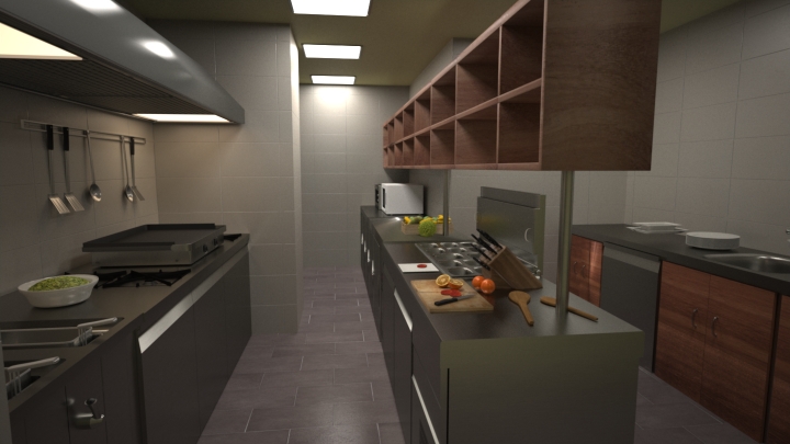 Muy buenas. Unos compañeros y yo estamos trabajando en el diseño y modelado de un restaurante, hemos estado haciendo pruebas sobre la cocina para ver el realismo de la imagen y no estamos nada conformes. Antes que nada, obvien los errores de texturizado que da la incompatibilidad de algunas texturas al pasarlas de XSI a maxwell que eso ya los tenemos en cuenta. Solo deseo que opinen sobre que podría hacer que la imagen se vea mucho más real que lo que tenemos aquí. Obviamente faltan sartenes cuchillos etc, es solo imagen de prueba.