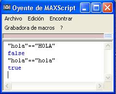 En el ejemplo anterior, el oyente de Maxscript compara el string hola con hola. Podemos ver que el resultado es false. Esto quiere decir que los dos string son diferentes. (ya que estamos, también podemos observar que el símbolo para hacer comparaciones es ==). En el segundo caso, como los dos string son iguales, el oyente devuelve true.