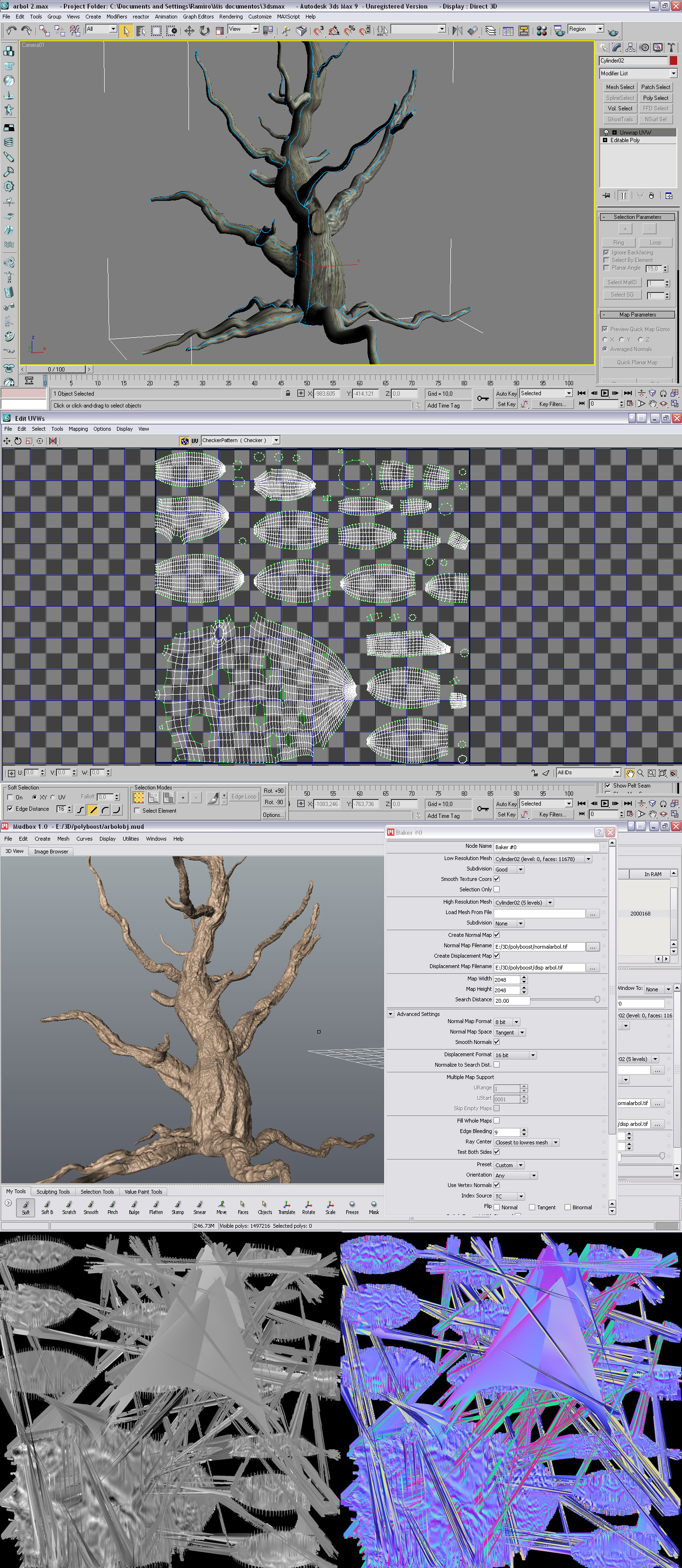 Hice un árbol, use Pelt mapping en Unwrap como para dejarlo bien mapeado y sin overlapping de Faces, etc. Exporte el obj y lo importe en Mudbox, lo esculpí un rato, y al exportar el displacement me sale terriblemente mal, probé cambiar el search distance, pero por lo que veo me quiere conectar las partes que están mapeadas y por ahí ubicadas arbitrariamente en el setting del UVW. Sinceramente no sé cómo hacer para que salga bien este proceso. He probado sacar el test both sides y tildar el fill whole map, pero pasa igual.