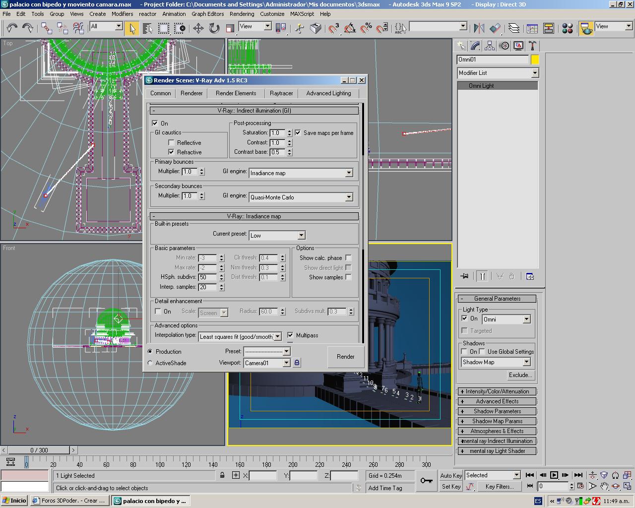 Adjunto el video para que se vea lo que pasa, el problema es que la sombras bajo los pies del bípedo aparecen y desaparecen y las sombras en los bloques de la izquierda igual. Es una luz omni que no proyecta sombras, ray 1.53 en 3ds Max 9 service pack 2, sampler en Quasi Montecarlo y GI con Irradiance Map.