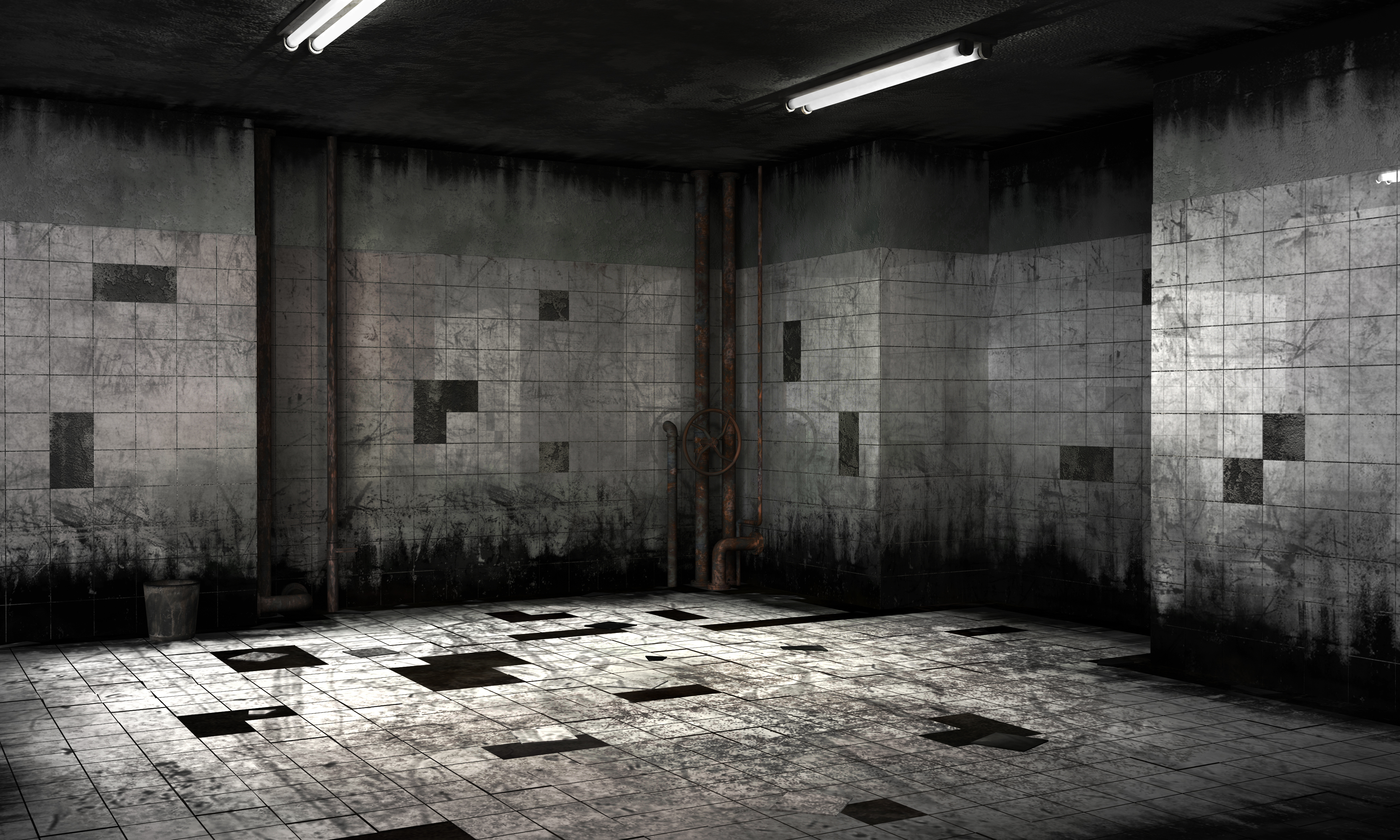 Antes que nada te comento que lo veo bien, pero mejorable, y que todos los comentarios son dudas y observaciones que no pienso deba ser así por obligación, solo un punto de vista, me llama la atención un poco la base de los muros que se ve negra y difuminándose hacia arriba, te preguntaría, porque el piso no está en con este efecto? Me parece que sí, pero que tendría que ser en una mayor área otro punto es que las losetas cerámicas tanto en piso como en muros carecen de profundidad o espesor, un ejemplo es que las losetas sueltas si tienen este espesor ahí se ve la comparación, el texturizado de la tubería la veo buena, tal vez le podrías poner más Bump para hacerla menos lisa, la textura de la manivela de paso en la tubería le falta aplicarle uvwmap tal vez para corregir la textura que se ve estirada, los tubos de luz me parecen muy buenos. (podrías contarme/nos un poco acerca de ellos? Un saludo.