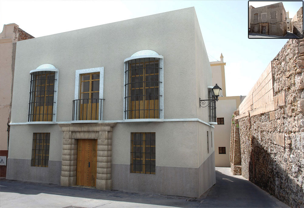 Es una restauración de una vieja casa, integrada en una fotografía real (en la esquina superior izquierda se muestra el estado actual).