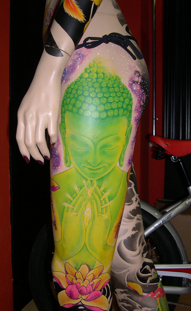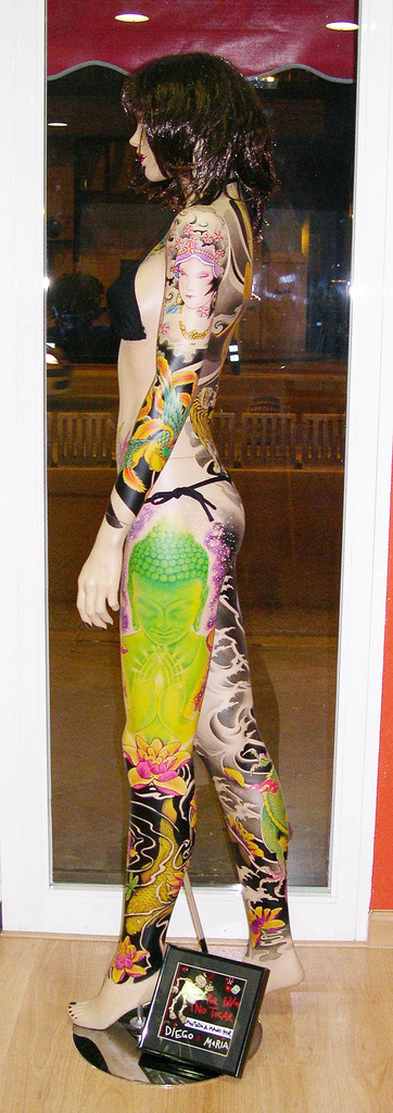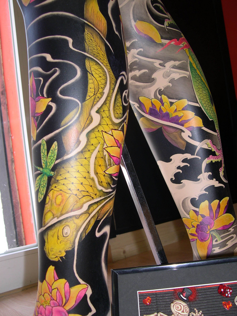 Sí Iherrero, sabía que a ti te iba a gustar más la primera, a mí me gusta también, pero es que, el color me da la vida. Kmk, muchas gracias Tron, sí, lo que me dices del contraste es porque no está terminado, le queda un cambio brutal, ya lo subiré sí, es que mira, el lado derecho ya es noche, todo morados, magentas y azules, lo que le da un totalmente diferente, el tema es que hasta que no le meta esos tonos no voy a integrar a la chica con los reflejos, y ahí es cuando va acoger más contraste y volumen, además, le hace falto un repaso en algunas zonas, sobre todo ahí arriba, que la piel empieza a cambiar y no aguanta igual, todo lo que ves es sólo una mano, digamos. También es que este tatto me lo he tomado hasta ahora un poco agónicamente, como es amiga se lo hago a los mediodías, con la hora pegada al culo, y cada vez que me ponía quería adelantar a saco, hasta esta última sesión, que ya he caído en que tiene demasiado detalle y que exige más paciencia. Pero vamos, que la verdad que estoy muy contenta de cómo está quedando, y me alegra mucho que te haya gustado, ah, lo que dices del chicano, sí, las calaveras y eso me encantan, pero de ese estilo poco más, no sé, no conecto, has visto el par que tengo en el Flickr? Ahí si tengo uno de calaveras, bueno, te dejo los enlaces por si acaso. A mí me mola el japonés, el new school, el color a saco vamos, aunque también el blanco y negro, yo que sé, es que me adapto a lo que sea porque me gusta tanto pinchar.