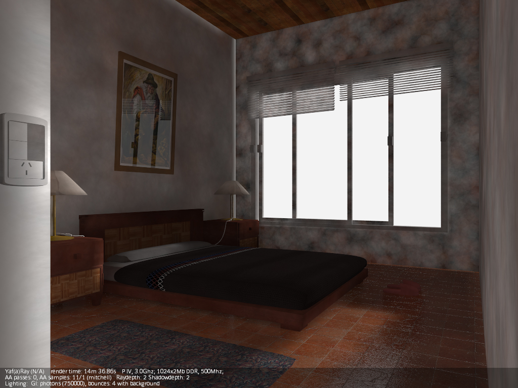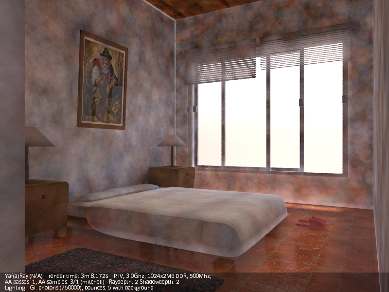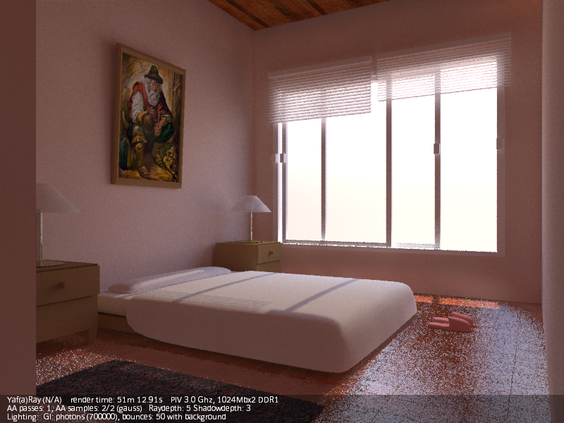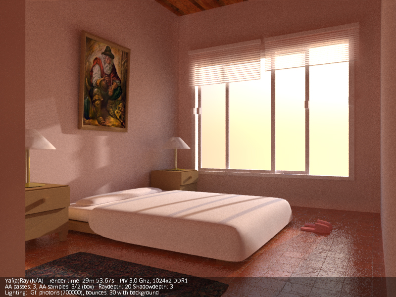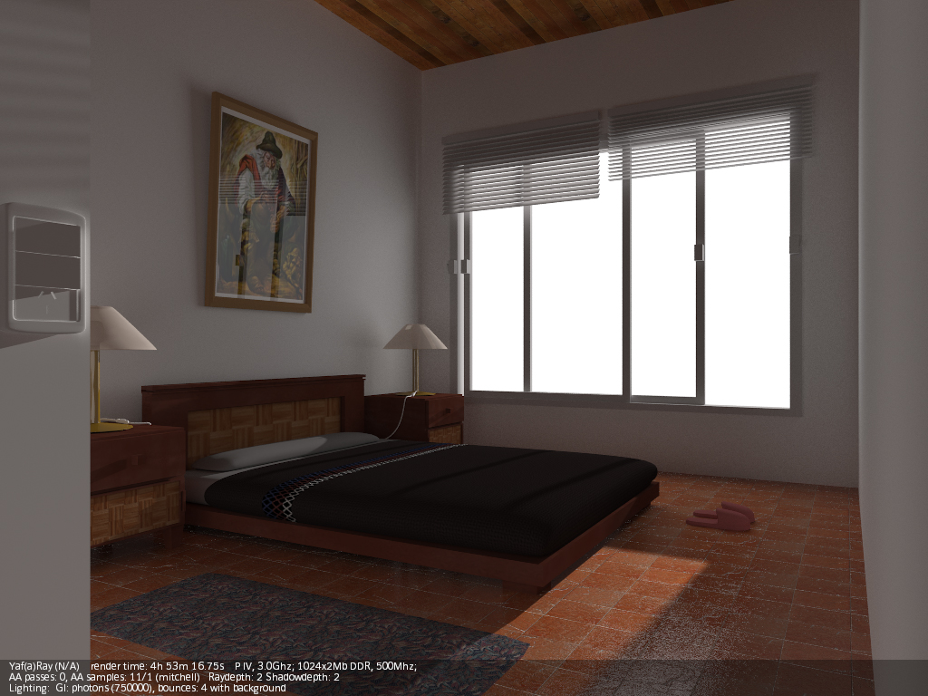 A mí lo que me cuesta más es dar con los valores correctos de luces (a veces un poco altos para que intervengan correctamente), y casi siempre tengo que añadir luces de relleno (de área), para complementar al hipotético sol (en interiores). Luego está el tema materiales, que para que, por ejemplo, se note un Bump, debes obrar con muchísimo cuidado, con valores bajos, como si YafRay y Blender trabajaran en unidades distintas (valores como 0,01 de Bump en el canal Nor, por ejemplo). Y otro tema aparte es el material Glass de YafRay. Dependiendo del ángulo de incidencia de la cámara, o solo refleja, o solo transparenta (refracta), y es un poco jodido dar con los valores correctos (debes jugar con el IOR, no siempre el 1.5 es el mejor,) y a veces es mejor usar un shinnydiffuse con transparencia y jugar con los valores de mirror.