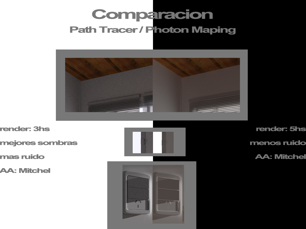Dale, así tengo un acompañante de choque, bueno poniéndonos más serios, termine el render con Path y el resultado es mucho mejor, tardo menos, 2 horas menos que el Photon y eso que no cuento las horas de testeo y cambios y pruebas y más cambios, tiene algo de ruido, pero si le subo un poco los valores creo que llego a las 5 horas del Photon, pero con mucho mejor manejo de la luz y la misma o menor cantidad de ruido, aquí están unas muestras.