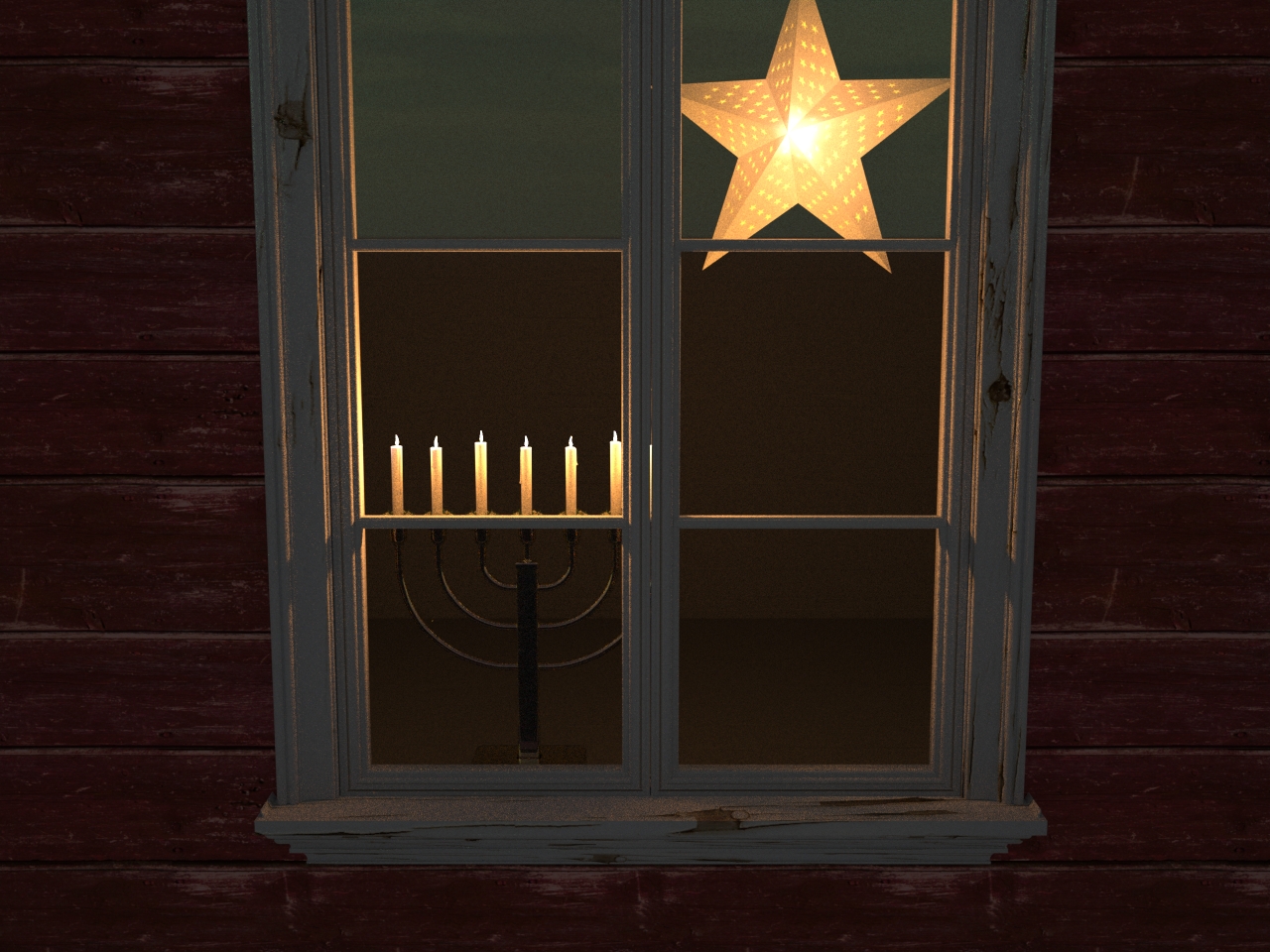 Estoy haciendo cada elemento por separado, de momento tengo echo el candelabro, la estrella de papel con una luz dentro, algún adorno más por decidir, y el marco de la ventana, todo lo más realista que pueda.