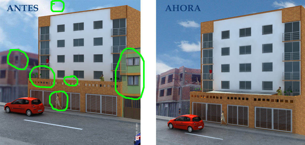 Hola de nuevo foreros. Básicamente me había dedicado a realizar modelados y renders de interiores. Pero me encargaron un trabajo de un exterior y componerlo en un entorno con un ángulo un poco complejo, en composiciones es la primera que realizo, además la construcción existente de la izquierda estaba sin terminar y tocaba desenfocarla un poco para que no se apreciará mucho, esta construcción debía quedar detrás del render y la construcción existente de la derecha había que clonarla para que se viera un poco la parte que no quedó en la fotografía y ubicar esta imagen delante del render, lo que para mí fue un poco difícil, igual necesito de su ayuda y apreciaciones.